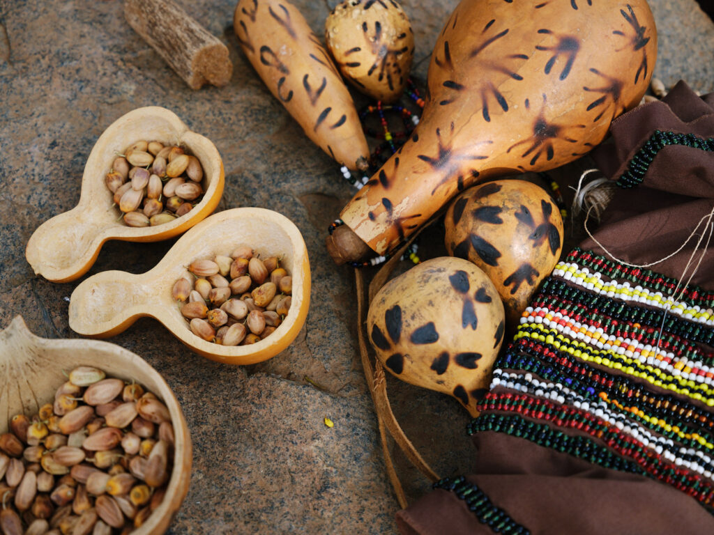 Men traditionally focus on basketry, as well as making calabashes. These vessels are formed from dried gourds and decorated with irons from the fire, then used for storing seed, brewing honey beer, and eating or drinking.